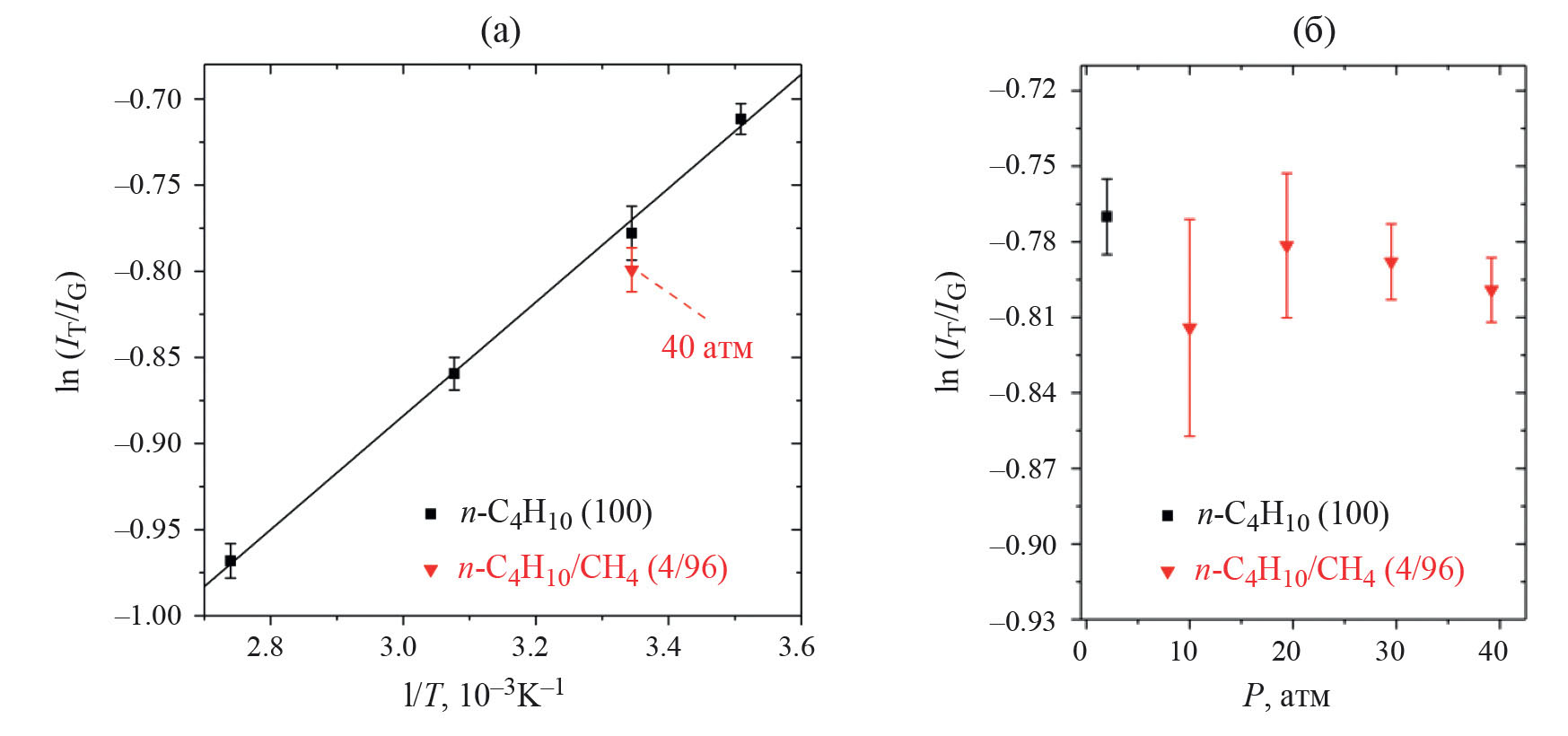 Рис. 3. Зависимости натурального логарифма отношения интенсивностей полос транс- и гош-конформеров н-бутана от температуры (а) и давления (б). Линейная аппроксимация показана сплошной линией. Доверительные интервалы указаны для 95% доверительной вероятности