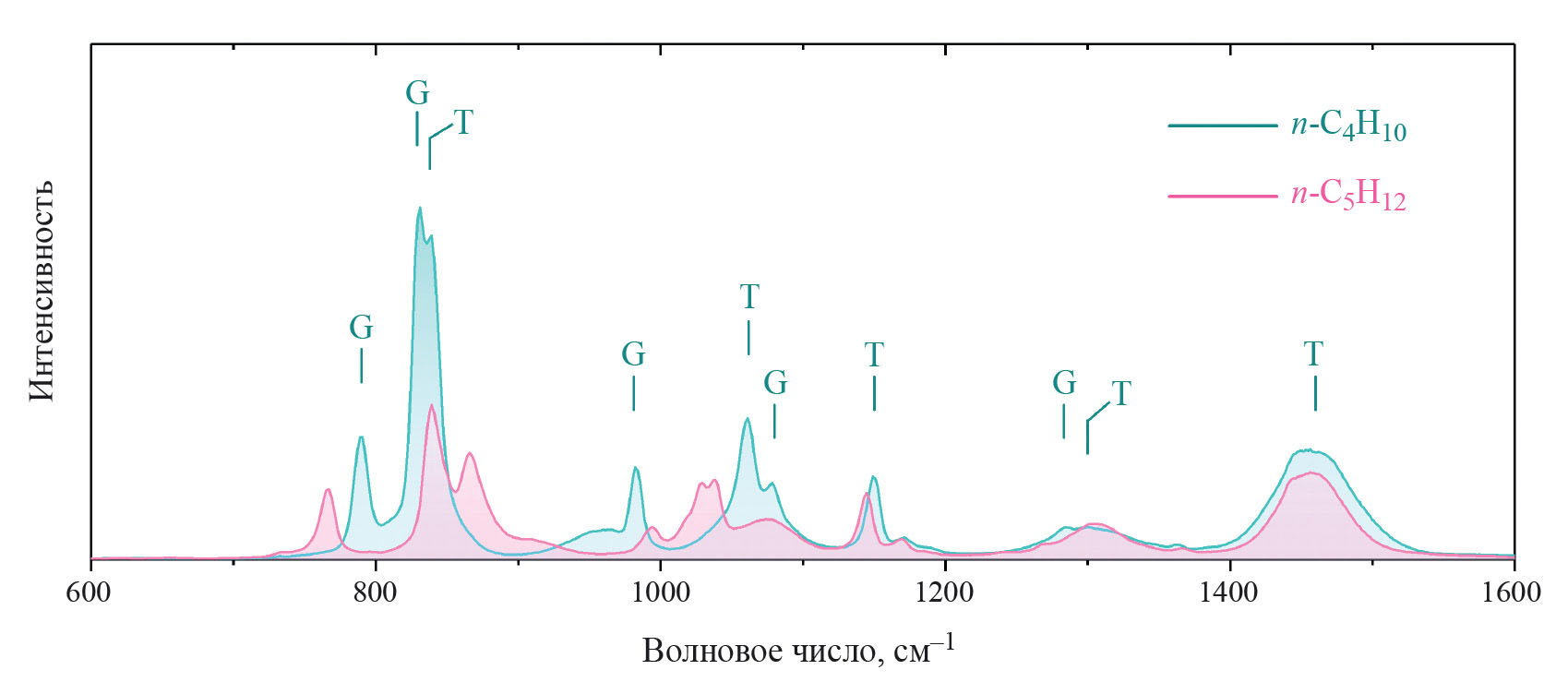 Рис. 4. Спектры КР н-бутана и н-пентана в диапазоне 600–1600 см–1. Полосы транс- и гош-конформеров н-бутана обозначены символами (T) и (G) соответственно