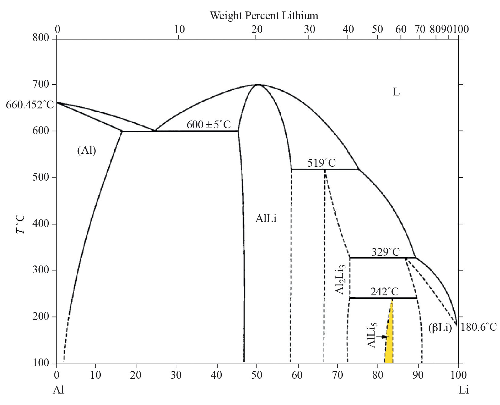 Рис. 1. Фазовая диаграмма состояния в системе Li – Al по данным исследования Массальски и Мюррея: по оси абсцисс – ат. (мол.) % Li, по оси ординат – температура в °C. Область существования фазы AlLi5 выделена нами