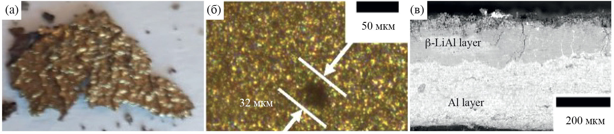 Отметим тот факт, что интерметаллид AlLi5 обладает золотисто-бронзовым цветом [12–14], в отличие от иных интерметаллидов LixAly, для которых, как правило, характерны серо-стальная (β-AlLi, согласно [12]), темно-серая (AlLi, согласно [15]) или металлически-серая (Al2Li3, по данным [16]) окраски (рис. 2).