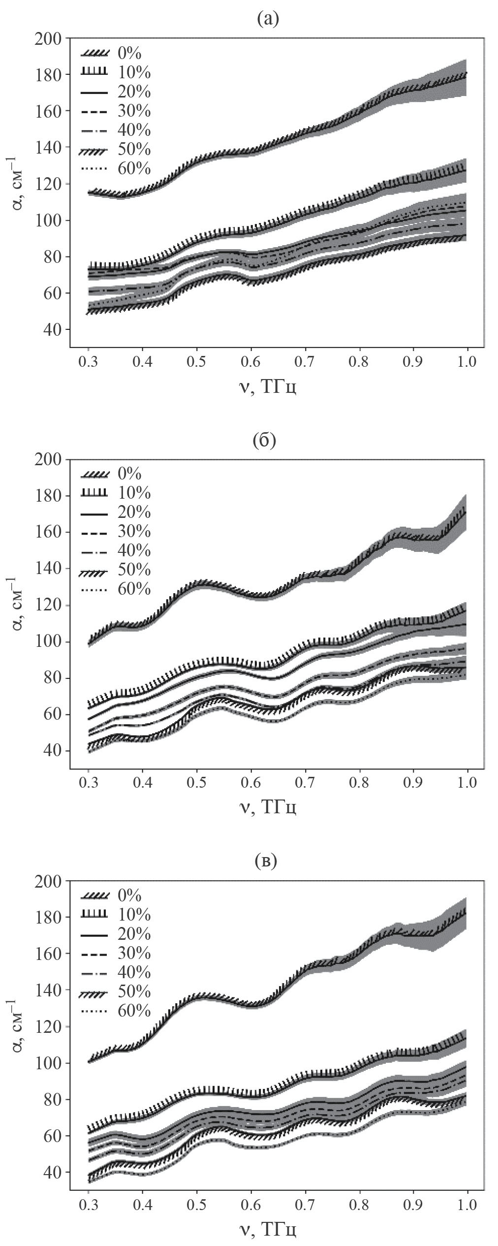 Спектр поглощения сухого порошка моногидрата лактозы имеет пик на частоте 0.53 ТГц (рис. 2). Все три растворителя имеют схожий коэффициент поглощения (рис. 3 при концентрации 0%), но имеются небольшие отклонения, например, для ВР воды в диапазоне 0.55–0.70 наблюдается менее заметное падение сигнала по сравнению с очищенной водой и ВР АТ к ИФНг. Добавление лактозы вызывает снижение коэффициента поглощения, что можно объяснить уменьшением объемной доли свободной воды.