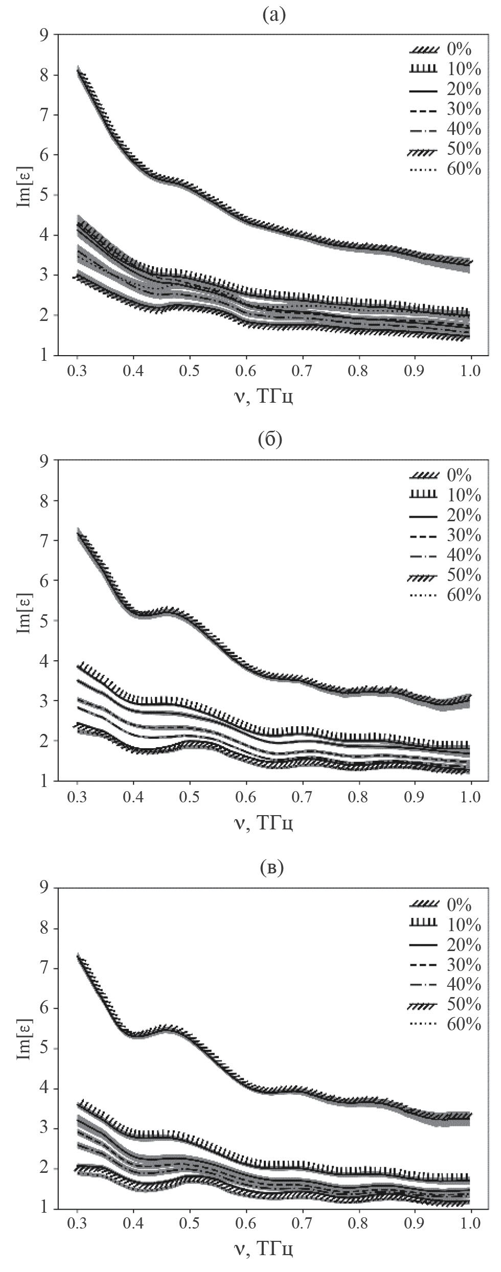 Рис. 4. Мнимая часть диэлектрической проницаемости (Im[ε]) трех видов раствора при концентрациях от 0% до 60%, (a) раствор ВР воды + лактоза, (б) раствор очищенной воды + лактоза, (в) раствор ВР АТ к ИФНг + лактоза