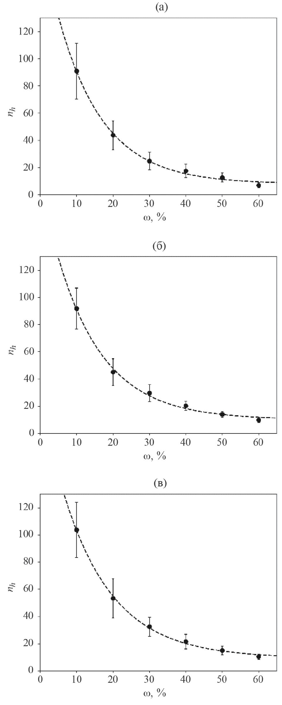 Рис. 5. Гидратационное число (nh) лактозы в трех видах раствора при концентрациях (ɷ) от 10 до 60%, (a) раствор ВР воды + лактоза, (б) раствор очищенной воды + лактоза, (в) раствор ВР АТ к ИФНг + лактоза. Столбики погрешностей представляют собой доверительный интервал, полученный посредством t-критерия Стьюдента с доверительной вероятностью 0.95