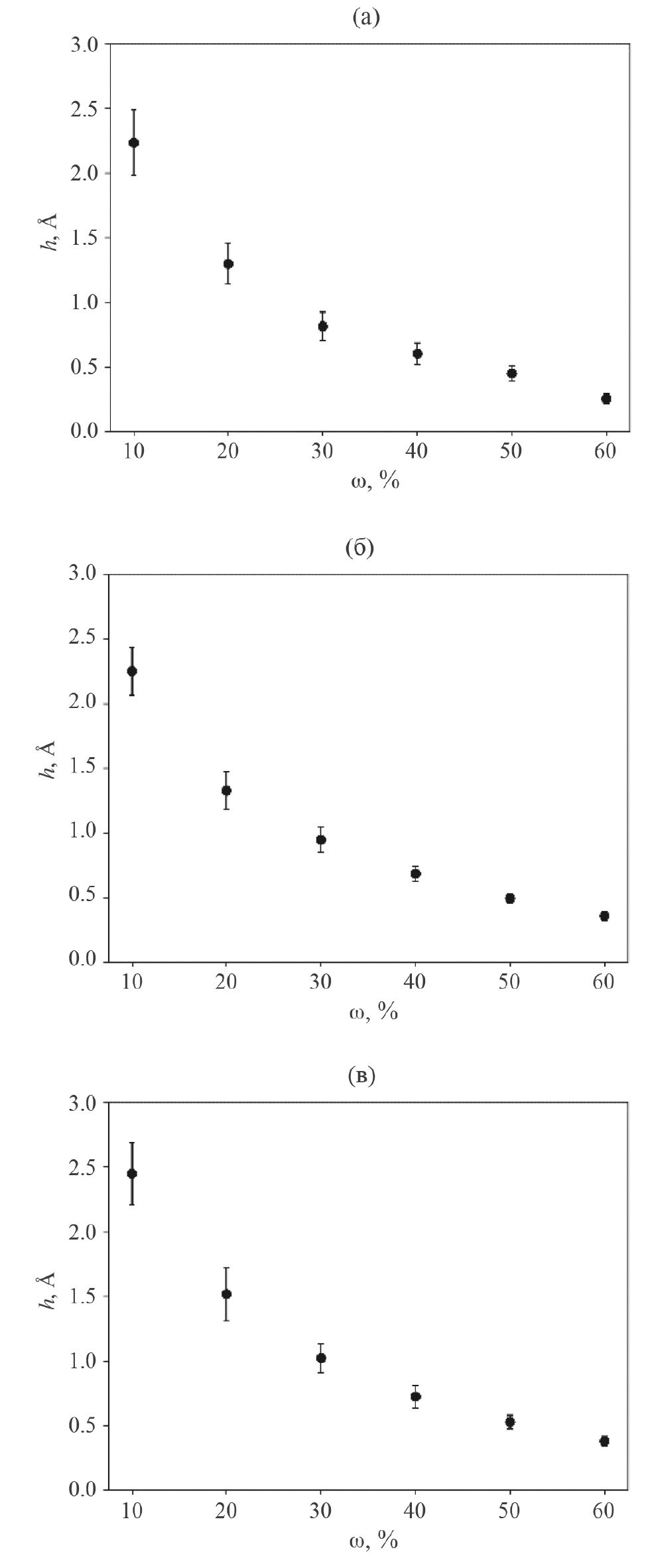 Рис. 6. Толщина гидратной оболочки лактозы (h) в трех видах раствора при концентрациях от 10% до 60%, (a) раствор ВР воды + лактоза, (б) раствор очищенной воды + лактоза, (в) раствор ВР АТ к ИФНг + лактоза. Столбики погрешностей представляют собой доверительный интервал, полученный посредством t-критерия Стьюдента с доверительной вероятностью 0.95