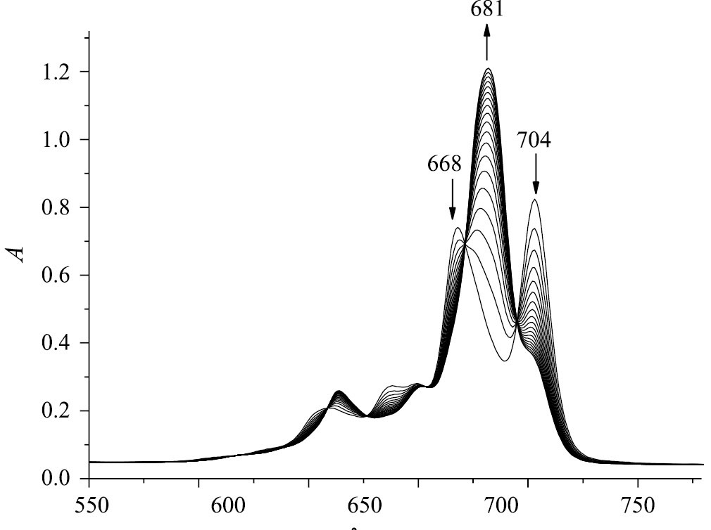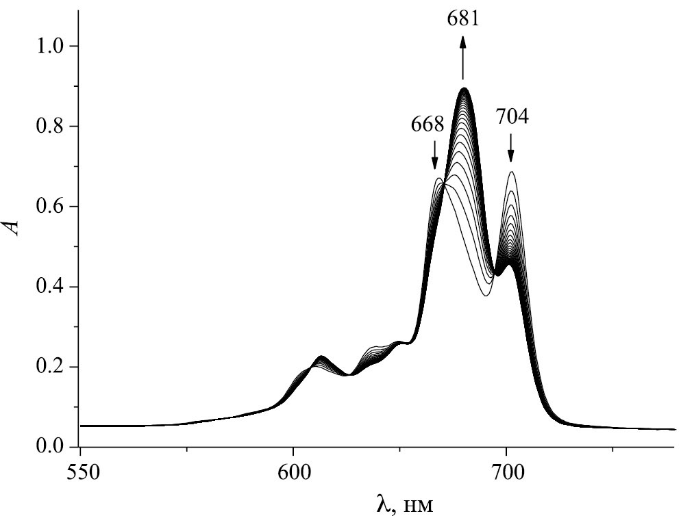 Спектральные исследования показали, что в среде инертного бензола электронный спектр поглощения (ЭСП) H2PcCl4(OPh-Me-i-Pr)4 имеет в видимой области две расщепленные Qх- и Qy-составляющие Q-полосы с λI = 704 и λII = 668 нм соответственно, что указывает на D2h-симметрию молекулы (рис. 1). В среде протоноакцепторного н-бутиламина (пиперидина) расщепление Q-полосы исчезает, а симметрия молекулы повышается от D2h до D4h (рис. 1). Следовательно, H2PcCl4(OPh-Me-i-Pr)4 в присутствии BuNH2 (Pip) проявляет свойства двухосновной NH-кислоты, а образующиеся при этом комплексы с переносом протонов не подвергаются деструкции с течением времени. На это указывает характер ЭСП H2PcCl4(OPh-Me-i-Pr)4 в н-бутиламине (пиперидине), который остается без изменений в течение ~ 67 ч при 333 К (рис. 1), в отличие от ЭСП комплексов образованных с участием β-замещенных порфиразинов [9].