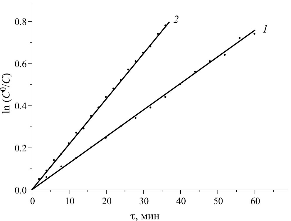 Рис. 4. Зависимости lnCo/C от времени реакции H2PcCl4(OPh-Me-i-Pr)4 с BuNH2 (1) и Pip (2) в бензоле при Т = 308 (2) и 318 К (1) и СоBuNH2 = 1.27 и СоPip = 2.53 моль/л в бензоле
