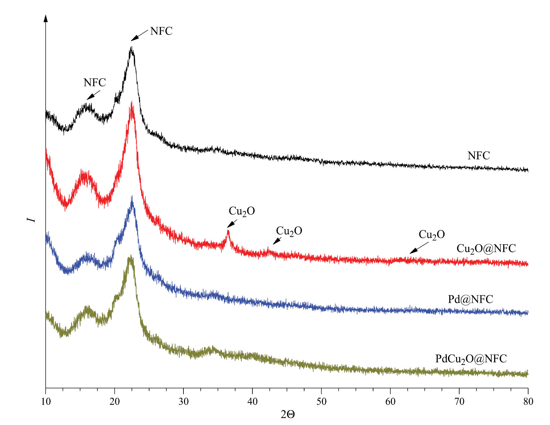 Индекс кристалличности наноцеллюлозы и полученных нанокомпозитов (табл. 1) по данным рентгеновской дифракции, рассчитанный по уравнению Сегала [20] как отношение интенсивности кристаллического рефлекса Ik при 2θ = 22.5° за вычетом максимальной интенсивности аморфного гало Ia при 2θ = 19°, к Ik: Ikr = (Ik–Ia)/Ik, составляет 0.53, 0.54, 0.51 и 0.46, соответственно, для NFC, Cu@NFC, Pd@NFC, PdCu2O@NFC. Cтепень кристалличности целлюлозных звеньев в этих же нанокомпозитах, рассчитанная по данным ИК-спектроскопии и методу [20] из отношения интенсивностей характеристических полос при 1430 и 900 см–1, согласно [21], равна 0.86, 0.86, 0.91 и 0.80. Таким образом, введение наночастиц в NFC приводит к небольшому разупорядочению, т. е. уменьшению кристалличности.