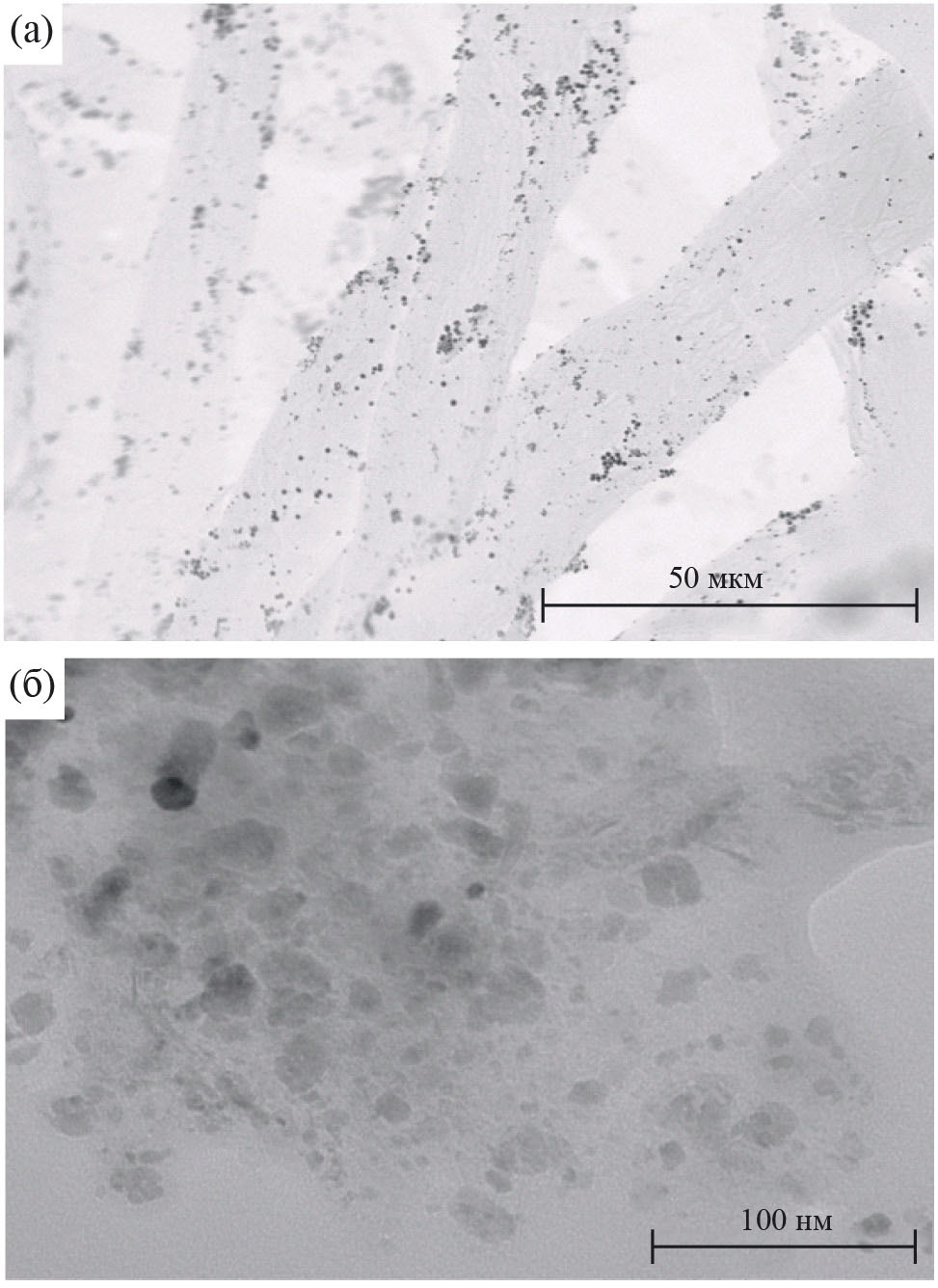 На микрофотографиях СЭМ (рис. 8а) нанокомпозитов Pd@NFC на фоне микрометровых волокон (длиной 30 мкм и толщиной 15 мкм) видны темные частицы, которые, по-видимому, представляют собой агрегаты из частиц палладия или оксидов палладия диаметром 310–840 нм.