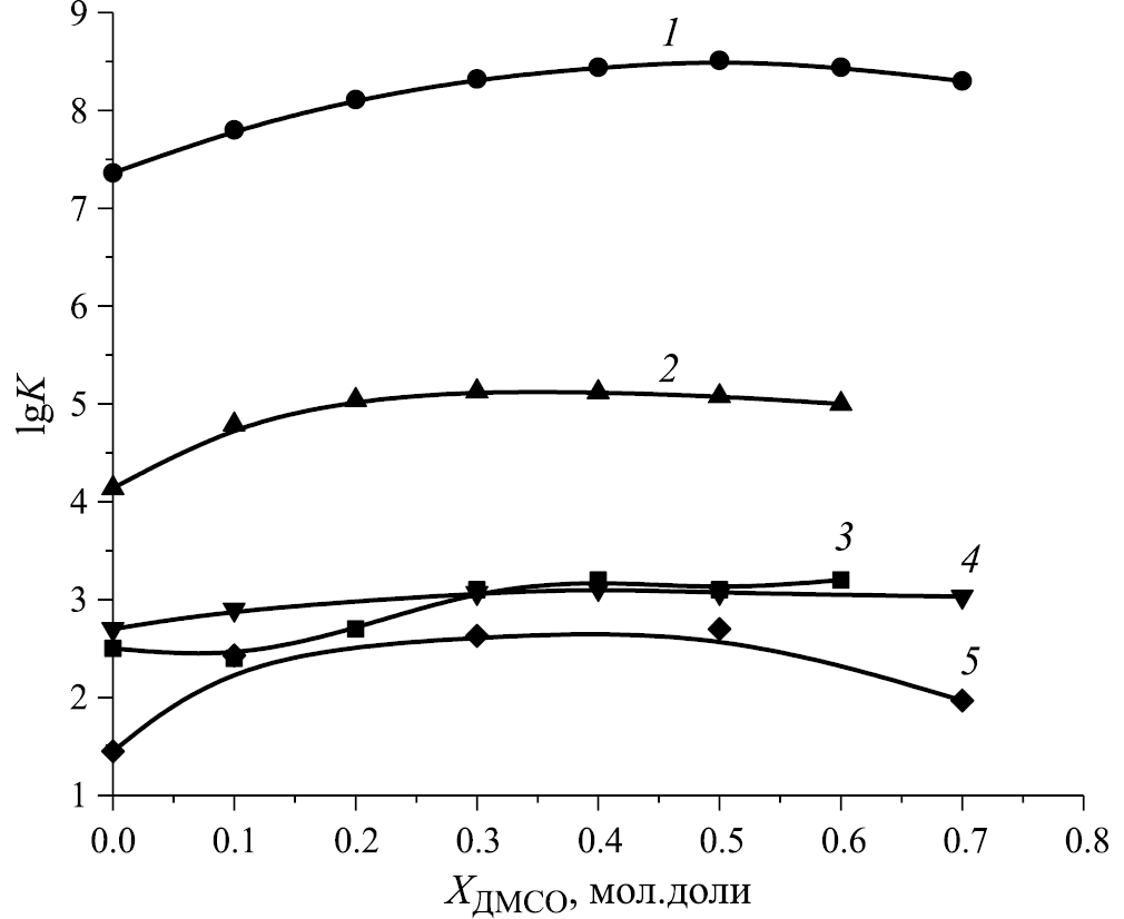Литературные данные свидетельствуют, что при увеличении содержания диметилсульфоксида в растворе устойчивость комплексов никеля(II) с N- и N-O-донорными лигандами возрастает [27–29]. При образовании биядерного криптата никеля(II) предпочтительней является структура, когда второй катион связывается с одним атомом азота криптанда[2.2.2] снаружи макроцикла [30], поэтому в водно-диметилсульфоксидных смесях наблюдается схожий характер изменения ступенчатой константы устойчивости биядерного комплекса никеля(II) с криптандом[2.2.2] и констант устойчивости комплексов Ni2+ с прочими азотсодержащими лигандами (рис. 2).