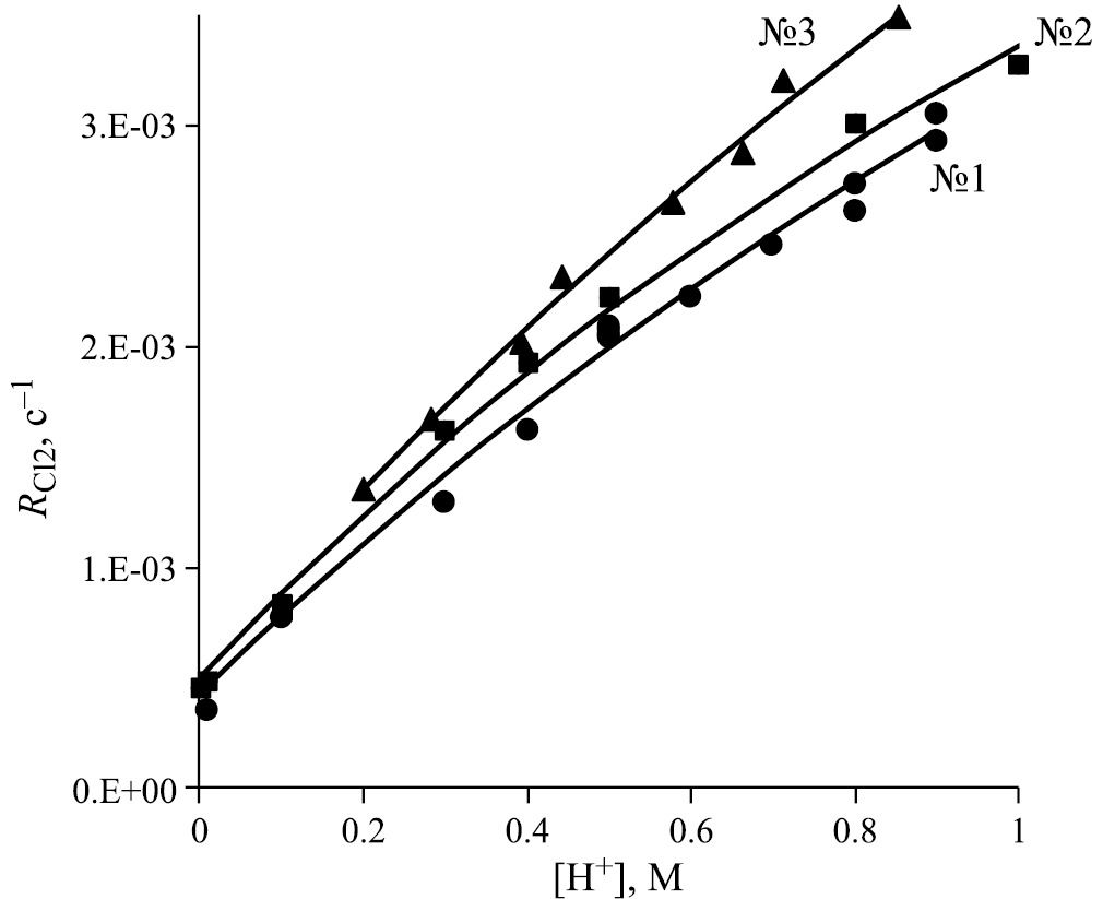 В экспериментах настоящей работы концентрация хлорид-ионов поддерживалась постоянной, а концентрация ионов водорода варьировалась. Константа скорости kO3+Cl– зависит от концентрации Н+ согласно выражению (8). Таким образом, формула (11) определяет величину RCl2 как функцию концентрации Н+, причем ее параметрами являются коэффициент массопереноса kLa, а также константа Генри озона HO3:
