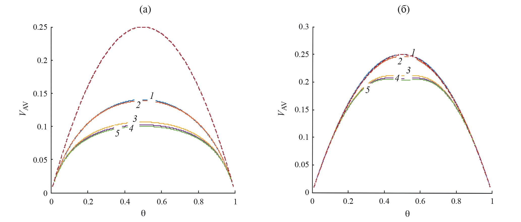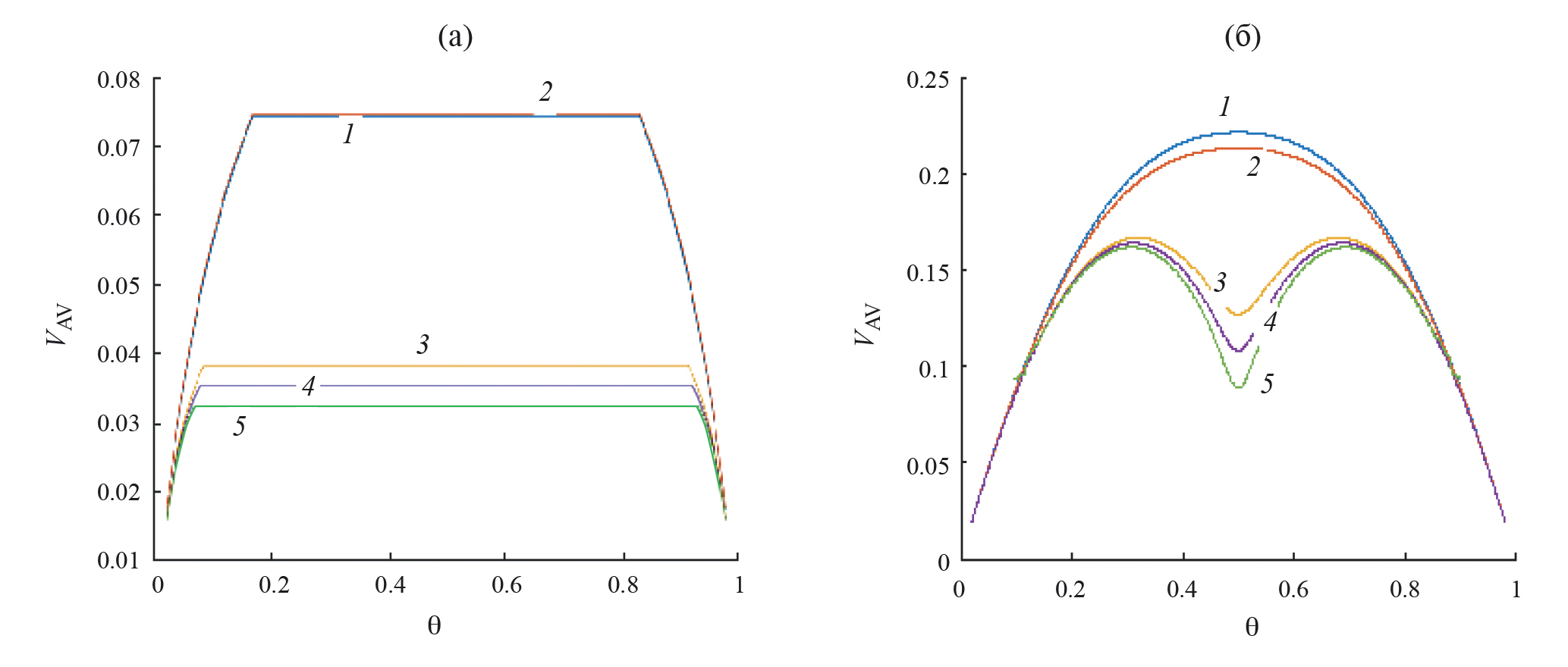 Рис. 3. Концентрационные составляющие скоростей VAV, рассчитанные в разных приближениях для притягивающихся (а) и отталкивающихся (б) частиц при τ = 0.9, α = 0.5, для КХП (1) и кластеров КВМ 2×1 (2), 2×2 (3), k1s (4), 3×3 (5).