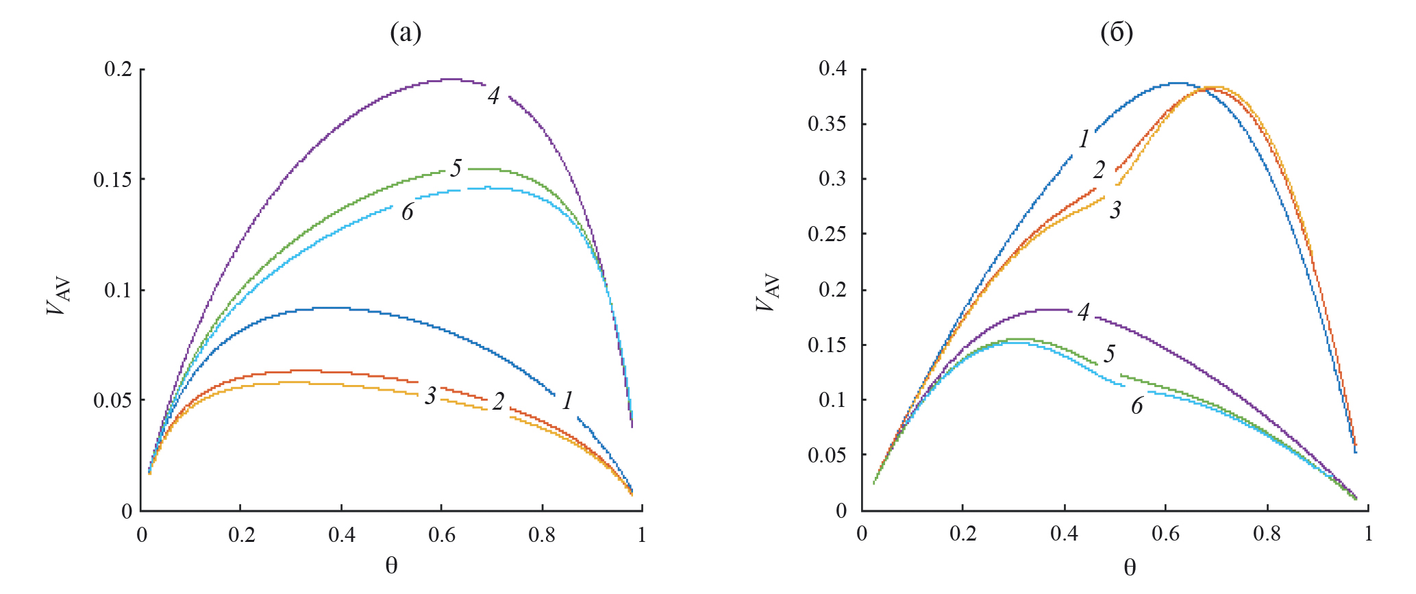 Варьирование параметра α представлено на рис. 4. Для притягивающихся частиц увеличение α смещает положение максимума зависимости VAV(θ ) от меньших значений θ к большим (а), тогда как для отталкивающихся частиц максимум с ростом α смещается от больших значений θ к меньшим (б).