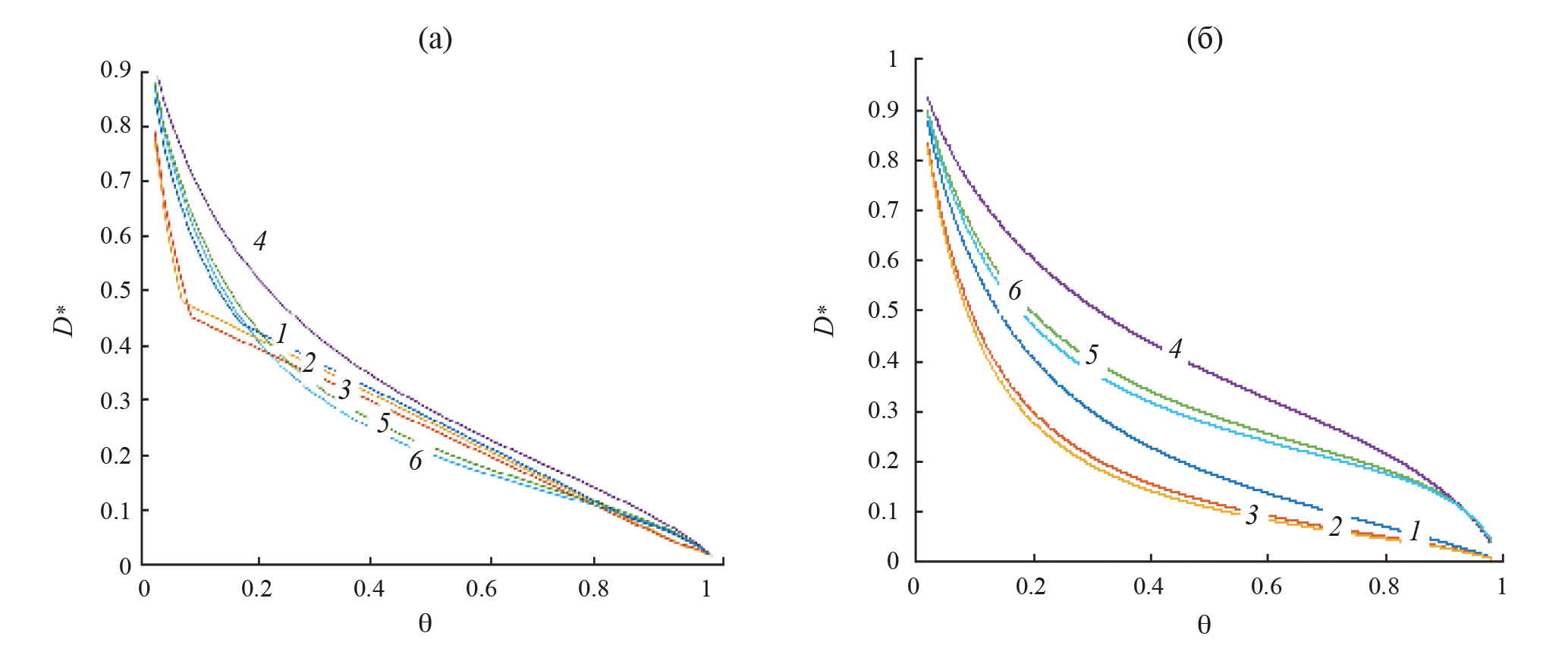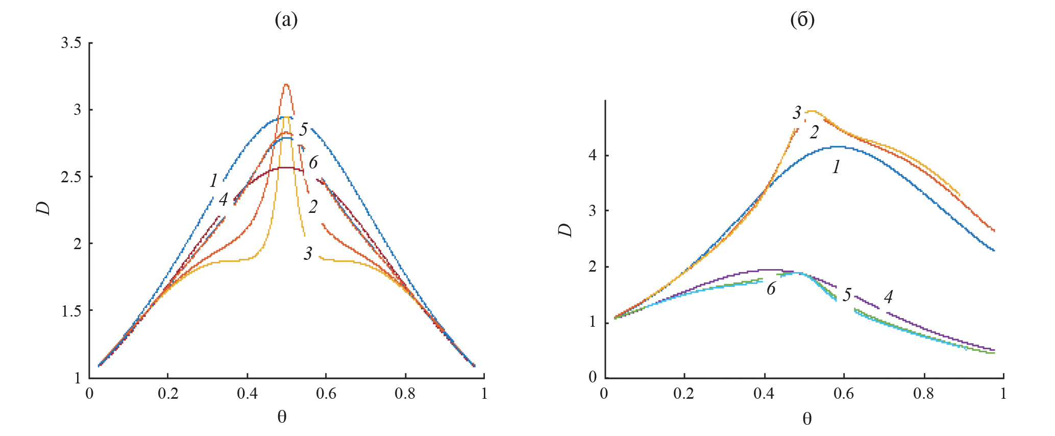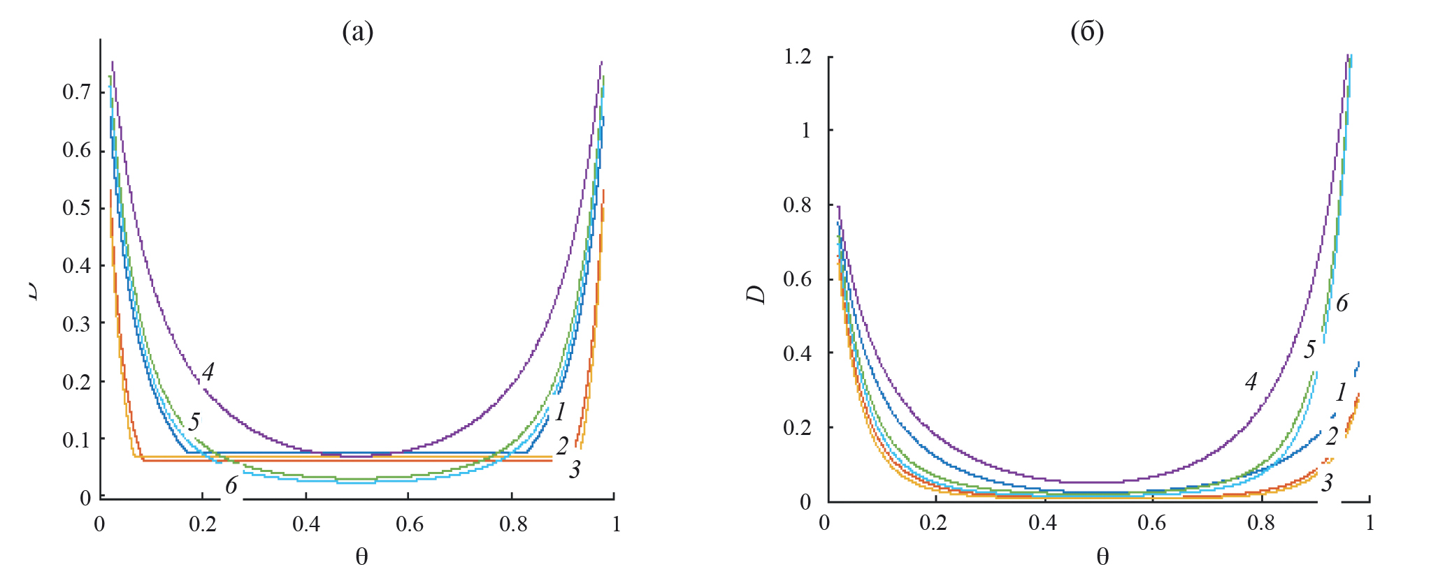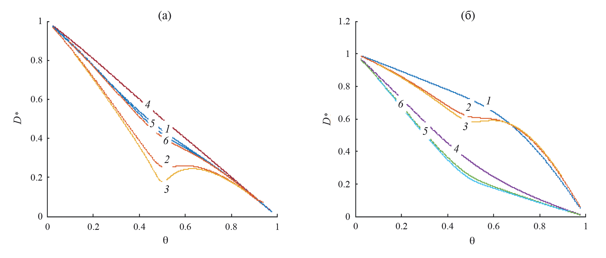 Для отталкивающихся частиц (б) реализуются те же закономерности: кривые симметричны, относительно точки θ = 0.5, и с ростом размера базисного кластера уменьшается скорость перескоков. Однако с повышением точности учета непрямых корреляций в окрестности θ = 0.5 происходит более точное описание распределения частиц и это приводит к появлению небольшого минимума на кривой 5 по сравнению с кривой 3. В данном случае идеальная модель также дает пунктирную кривую, практически совпадающую с кривой 1 в КХП – отталкивающиеся частицы располагаются на удалении друг от друга, чтобы не испытывать взаимодействия, как в идеальной системе.