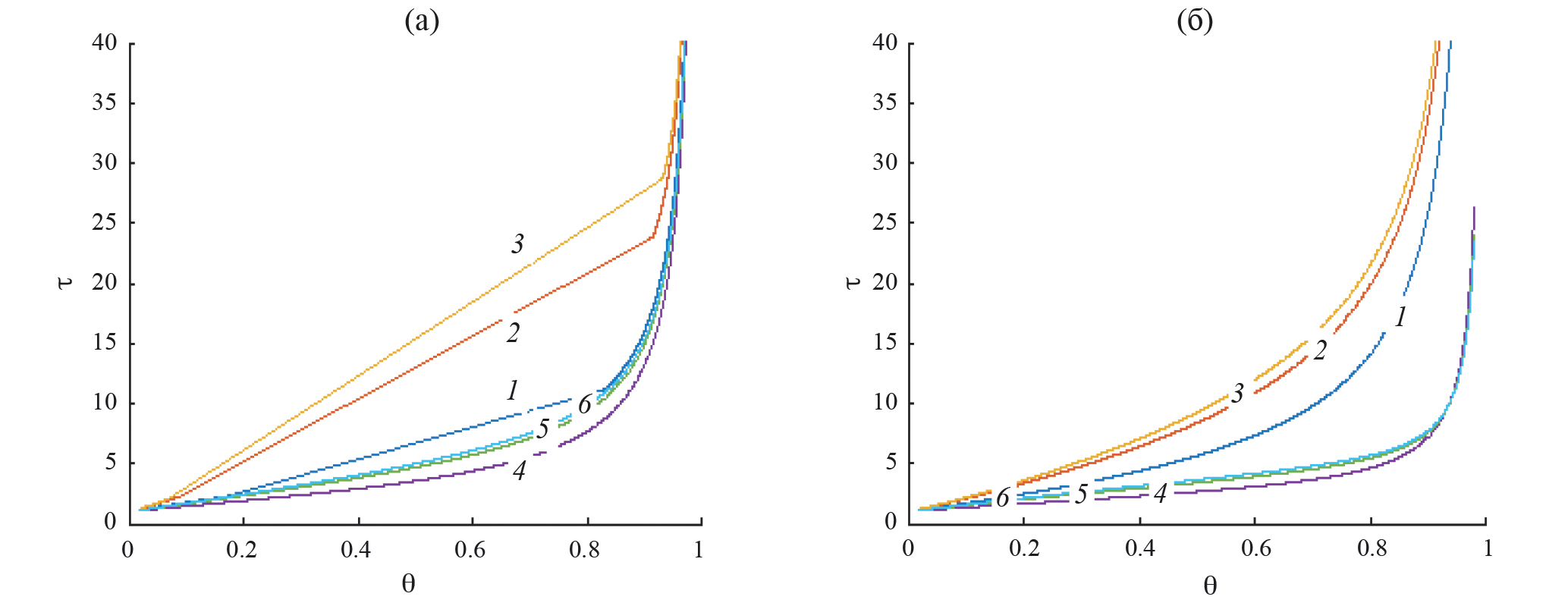 Для отталкивающихся частиц на рис. 6 наблюдаются аналогичные расположения кривых КХП (1, 4) и КВМ 2×2 (2, 5) и 3×3 (3, 6) по мере увеличения точности учета непрямых корреляций как при разных температурах (рис. 6а), так и при увеличении параметра α (б). В то же время смена знака параметра латерального взаимодействия приводит к изменению расположение кривых с разными значениями параметра α, как на рис. 1 и 4.