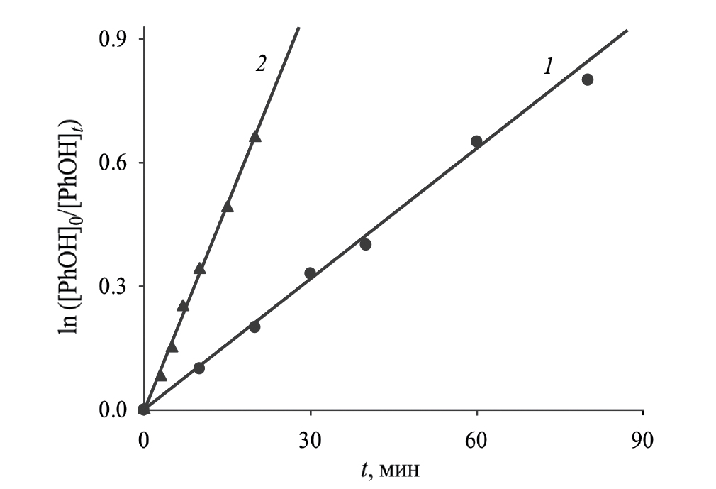 где [PhOH]0 и [PhOH]t – начальная и текущая концентрации фенола, соответственно (моль/л); kʹ – эффективная константа скорости реакции первого порядка (мин–1).