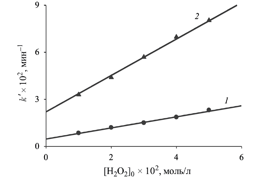 Оказалось, что эффективная константа скорости kʹ линейно возрастает с увеличением начальной концентрации пероксида водорода (рис. 2):