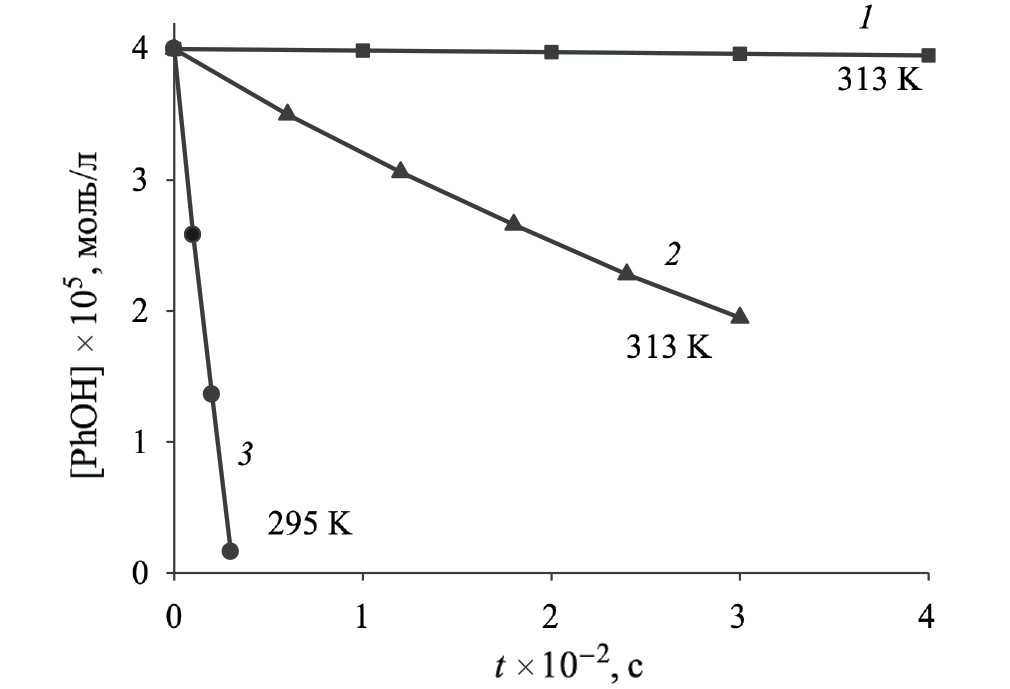 Реакцию фенола с пероксидом водорода в водных растворах проводили в стеклянном термостатируемом реакторе (температуру в реакторе поддерживали с помощью термостата LOIP LT-105a). Кинетику процесса изучали методом отбора проб, определяя остаточные концентрации PhOH через определенные промежутки времени. Начальная концентрация фенола в реакционной смеси составляла 4 × 10–5 моль/л, концентрацию пероксида водорода варьировали в пределах (1.0–5.0) × × 10–2 моль/л. При этом во всех опытах поддерживался избыток пероксида водорода по отношению к фенолу.
