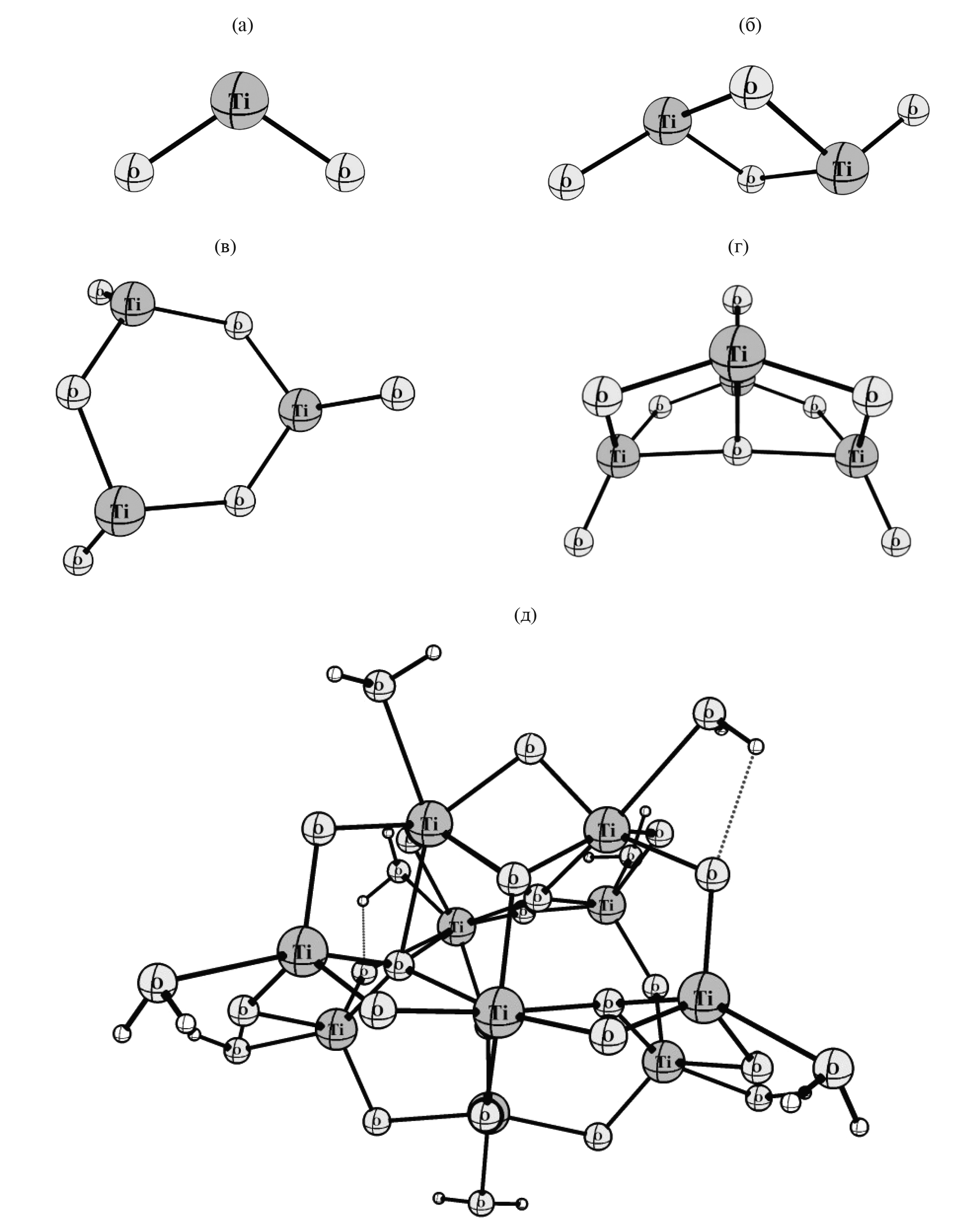 Рис. 1. Оптимизированные структуры молекулы TiO2 (а), кластеров (TiO2)n (n = 2 (б), 3 (в) и 4 (г)) и комплекса (TiO2)10 (H2O)9 (д).