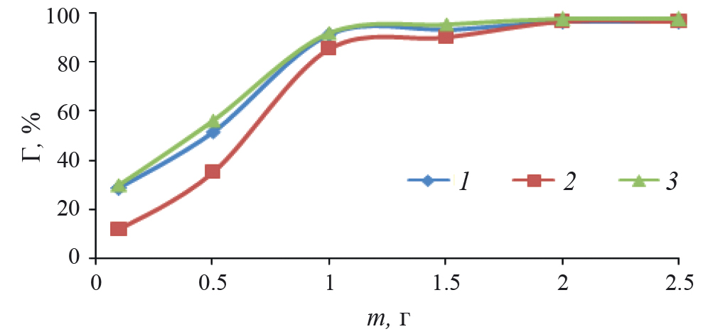 Рис. 3. Зависимости степени сорбции ионов Fe (1), Cu (2), Zn (3) от массы глины.