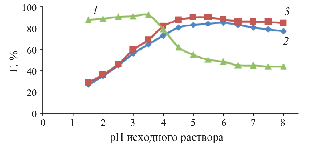 Рис. 4. Влияние рН исходного раствора на сорбцию ионов Fe (1), Cu (2), Zn (3).