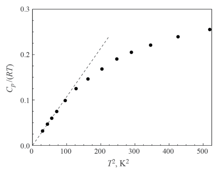 Рис. 2. Теплоемкость в координатах Cp,m(T)/(RT) от T 2 для Cu(C11H19O2)3 в диапазоне температур 0–25 K: черные кружки – экспериментальные данные, пунктирная линия соответствует закону Дебая.