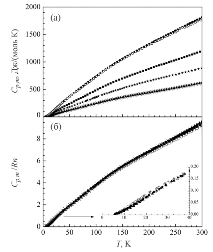 Полученные экспериментальные данные о теплоемкости были сглажены с помощью суммы функций Эйнштейна–Планка [16, 17]:
