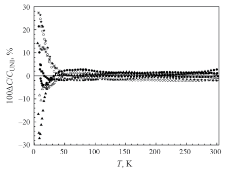 Рис. 4. Отклонения (ΔС=Cp,m – СUNI) экспериментальных значений теплоемкости дипивалоилметанатов металлов от универсального описания СUNI (2): черные треугольники – Cu(dpm)2, снежинки – Pd(dpm)2, пустые кружки – Co(dpm)3, крестики – Al(dpm)3, черные квадраты – Zr(dpm)4, пустые треугольники – [Eu(dpm)3]2, черные кружки – [Tb(dpm)3]2.