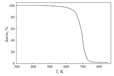 Термогравиметрический (ТГ) анализ карбосиланового дендримера G6[OSi(СH3)3]256 был проведен с помощью термомикровесов TG 209 F1 Iris (NETZSCH, Германия) в температурном интервале 300–850 K в атмосфере аргона. Скорость нагревания ампулы с веществом составляла 5 K/мин. Результаты анализа показали, что температура начала разложения исследуемого дендримера T = 600 K (потеря массы – 2%). Термогравиметрическая кривая для дендримера G6[OSi(СH3)3]256 представлена на рис. 2.