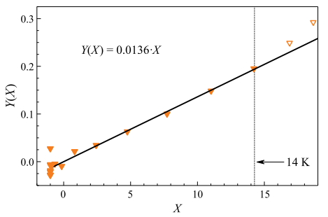 Рис. 2. Теплоемкость ZnWO4 в координатах Y(X): треугольники – экспериментальные значения; прямая линия – описание экспериментальных точек уравнением Y(X) = 0.0136·X, область справедливости которого лежит в интервале 0–14 K.
