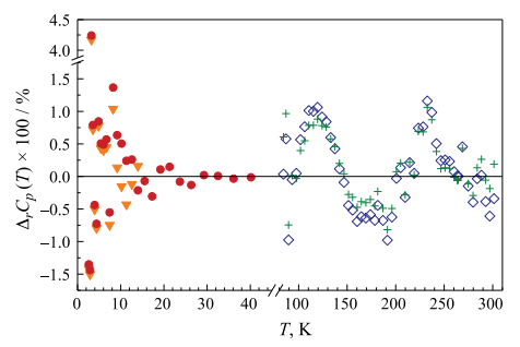 Рис. 3. Относительное отклонение экспериментальных значений от сглаженной теплоемкости (нулевая ордината) для ZnWO4: треугольники – описание уравнением (1) в интервале 2.6–14 K; кружки и ромбы – описание уравнением (3) данных настоящей работы в интервале 2.6–40 K и данных [12] при 81–301 K соответственно, плюсы – сглаженное описание экспериментальной теплоемкости полиномом по данным [12]. Экспериментальная точка #3 при 3.21 K статистически значимо отклоняется (треугольник и кружок, 4.2%), она была исключена из рассмотрения при нахождении сглаженного описания.