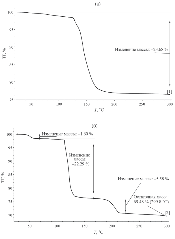 Кривые ТГА снимали на приборе NETZSCH TG 209 F1 Libra в интервале температур 298.15–573.15 К для определения содержания влаги в образцах; скорость нагрева составляла 10 К мин–1. Измерение проводили в потоке воздуха при расходе газа 40 мл мин–1. Масса образца составляла 20–30 мг. Термогравиметрическую кривую обрабатывали с помощью программы NETZSCH Proteus Analysis. Результаты эксперимента представлены на рис. 1.