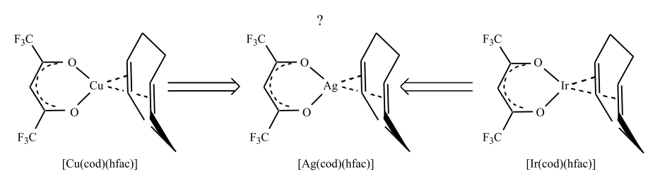 В фокусе настоящей работы находится исследование комплекса [Ag(cod)(hfac)]2 и оценка термодинамических параметров (сублимация и испарение) этого соединения с привлечением данных по его ближайшим аналогам, [Cu(cod)(hfac)] и [Ir(cod)(hfac)] (рис. 1).
