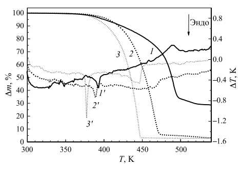 Образец [Ag(cod)(hfac)]2 сохраняет первоначальную массу примерно до 360 K, при дальнейшем повышении температуры начинается парообразование вещества, сопровождающееся его значительным разложением, которое завершается к 500 K (рис. 2). Масса нелетучего остатка составляет ~ 29%. Потеря массы образца начинается после плавления. Обнаруженный на ДТА-кривой единственный эндоэффект при температуре 392 K относится к плавлению, значение прекрасно согласуется с результатами ДСК.