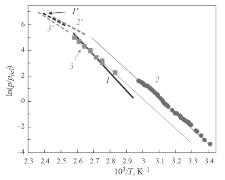 Рис. 3. Температурные зависимости давления насыщенных паров над веществами в кристаллической, [Ag(cod)(hfac)]2 (1, линия – эта работа), [Cu(cod)(hfac)] (2, ● – [7]), [Ir(cod)(hfac)] (3, ■ – [8]), и жидкой фазах, [Ag(cod)(hfac)] (1’, пунктир – эта работа), [Cu(cod)(hfac)] (2’, пунктир – эта работа), [Ir(cod)(hfac)] (3’, пунктир – эта работа), pref = 1 Па.