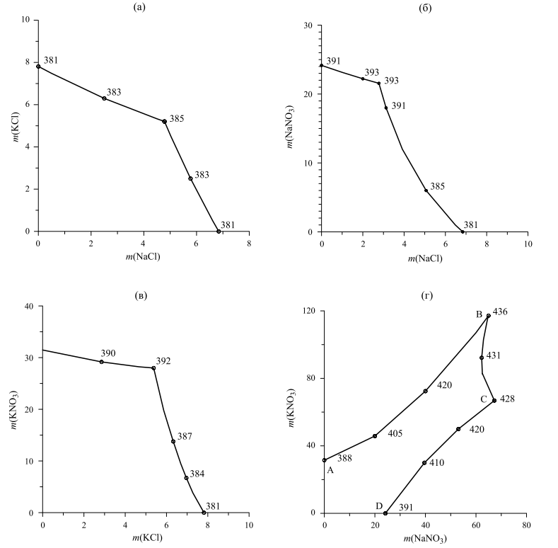 На рис. 2 показаны результаты расчета для четырех трехкомпонентных систем “соль I – соль II – вода”, являющихся подсистемами взаимной системы Na+, K+// Cl–, NO3– – H2O. Каждая из этих систем помимо воды включает следующие пары солей: NaCl–KCl (рис. 2а), NaCl–NaNO3 (рис. 2б), KCl–KNO3 (рис. 2в), NaNO3–KNO3 (рис. 2г), т. е. эти системы содержат один общий и два разных иона (катиона или аниона). Линии на рисунках соответствуют составам насыщенных растворов при температурах кипения (т. е. при давлении пара воды над ними PH2O = 1 бар). У некоторых точек на этих линиях отмечены температуры кипения таких растворов.