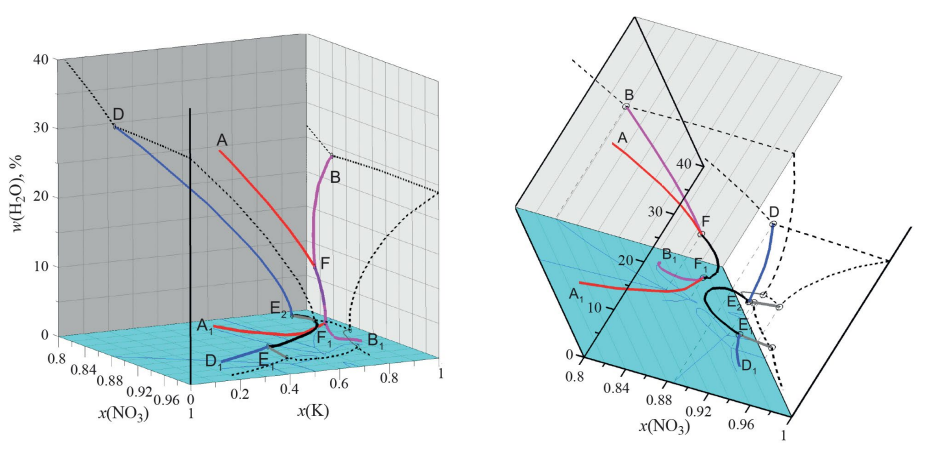 Для визуализации результатов расчета фазовых равновесий в изучаемой взаимной системе удобно использовать призму, показанную на рис. 2 (на рисунке она представлена под разными углами поворота). На графике по горизонтальным осям откладываются мольные доли ионов – x(NO3–) и x(K+), а по вертикальной оси – содержание воды, выраженное в вес.%, так что нижняя грань призмы соответствует безводным солям. Фигуративные точки, изображающие валовый состав смеси, образующейся при смешении трех различных веществ в разных пропорциях, образуют слегка искривленную поверхность внутри такой призмы, близкую к плоскости. Тонкими линиями на нижней грани призмы показаны проекции составов насыщенных растворов на плоскость составов безводных солей. На рис. 3 эти линии представлены в виде двумерного графика. В табл. 2 дана расшифровка обозначения линий, ограничивающих поля на диаграмме состояний взаимной системы при давлении PH2O = 1 бар.