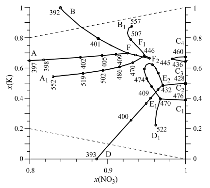 С помощью рис. 2 и 3 можно определить, в каких равновесиях участвует насыщенный раствор заданного состава при определенной температуре. Можно также проследить изменение температуры кипения насыщенного раствора при движении произвольно выбранной фигуративной точки. Рассмотрим, например, изменение свойств смеси исходного состава A при движении к конечному состоянию А1 (когда система содержит исчезающе малое количество осадка, то есть воды немного меньше, чем присутствует в насыщенном растворе). В точке A при температуре 397 K раствор сосуществует с кристаллическими NaCl и KCl. При изменении валового состава вдоль линии AF и постепенном повышении температуры до 413 K состав осадка изменяться не будет. В точке F полностью растворяется KCl, но начинает выделяться KNO3. Вдоль траектории F–F2–F1 температура кипящего раствора повышается до 446 К при наличии в осадке NaCl и KNO3. При переходе от фигуративной точки F1 к A1 и росте температуры до 552 К в равновесии с кипящим раствором снова будут находиться NaCl и KCl. По мере движения от А к А1 насыщенный раствор будет становиться все более концентрированным.