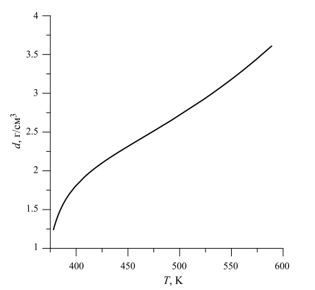 где ww, wi – весовые доли воды и i-го растворенного вещества соответственно, vw0 – удельный объем воды, ck (k = 0–4) – известный набор параметров, свой для каждой соли, t – температура (°С), w2,i – весовая доля соли в i-м бинарном растворе, выбранная по определенному правилу. Рассчитанная плотность раствора возрастает от 1.241 до 3.415 г/см3 при нагревании от 378 до 572 К, так как насыщенный раствор становится все более концентрированным. Граничные значения температур, для которых в [7] получены параметры модели, составляют 398, 373, 368 К для водных подсистем с KCl, NaNO3 и KNO3 соответственно. Поэтому приведенная выше формула представляет собой экстраполяцию оригинальных модельных зависимостей на более высокие температуры.