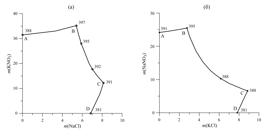 Рис. 9. Рассчитанные составы насыщенных водных растворов для систем, образованных веществами NaCl, KNO3, H2O (а) и KCl, NaNO3, H2O (б) при давлении пара H2O 1 бар. Концентрации солей выражены в шкале моляльностей, температура – в К (цифры у точек). Буквенные обозначения AB, BC, CD отвечают следующим составам осадка {KNO3+ KCl + NaCl} (a) и {NaNO3, NaCl, KCl} (б).