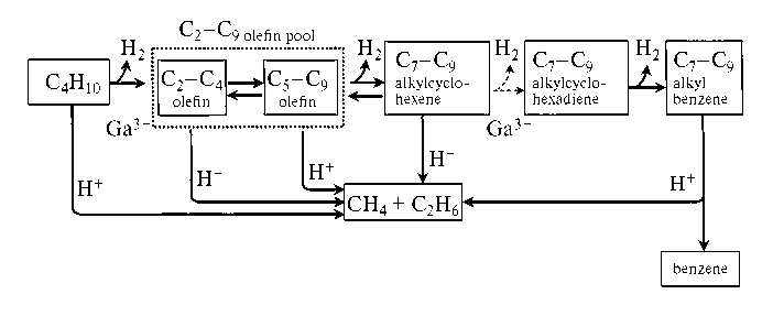 Ключевыми этапами для селективного образования ароматических УВ было предложено считать дегидрирование бутана в бутен и алкилциклогексена в алкилциклогексадиен. Таким образом, был сделан вывод, что при использовании цеолита HZSM-5 для обеспечения присутствия кислотных центров, улучшение дегидрогенизационной активности Ga повысит селективность по ароматическим УВ.