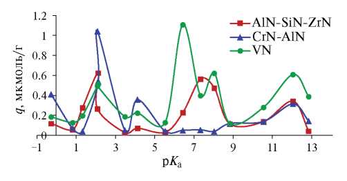 Для установления количества центров определенной кислотно-основной силы строили кривые распределения концентрации поверхностных активных центров с определенным значением рКа, используя большой рабочий набор красителей-индикаторов Гаммета (табл. 1). Из данных, представленных на рис. 3 следует, что на поверхности композита CrN-AlN доминируют апротонные основные центры Льюиса и сильнокислотные центры Бренстеда (рКа 2.01, 4.1). Поверхность образца на основе нитрида ванадия VN имеет наибольший набор сильнокислотных и слабокислотных центров Бренстеда.