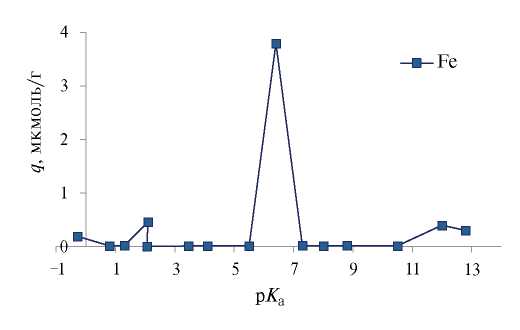 Видно, что металлическое железо образует на своей поверхности главным образом слабокислотный центр с рКа 6.4. При исследовании водной суспензии ферросилиция было показано [17], что поверхностное железо окисляется растворенным кислородом до ионов Fe2+ и Fe3+, которые в нейтральной и слабощелочной средах гидролизуются с образованием соответствующих гидроксидов. Далее гидроксиды кристаллизуются в оксиды. Кремний же существует в устойчивой форме монокремниевой кислоты. При исследовании поверхностных активных центров оксида железа(III) авторами [18] также обнаружены преимущественно слабокислотные бренстедовские центры (рКа 0–7), которые образуются в результате полной или частичной гидратации железа.