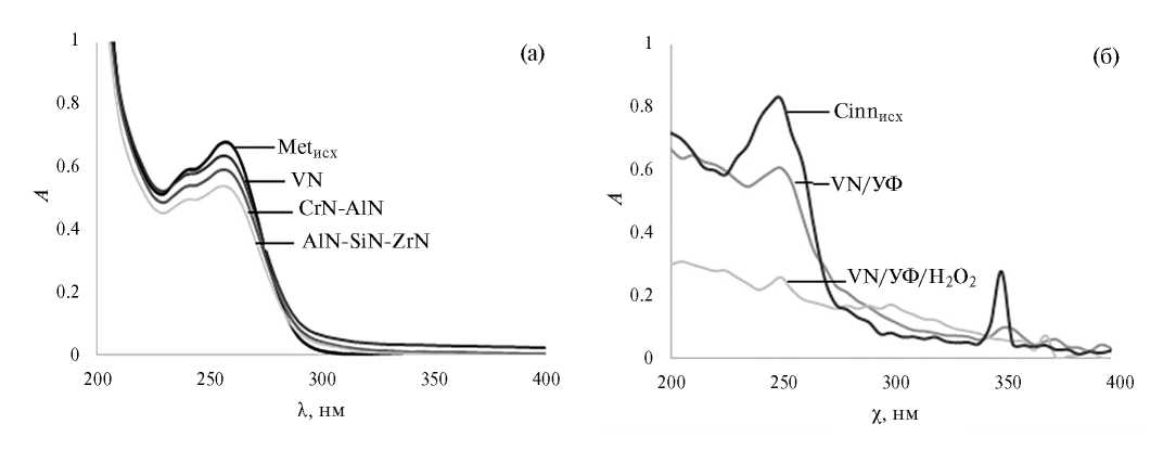 Рис. 5. Электронные спектры поглощения: а – раствора метамизола до и после адсорбции, б – раствора циннаризина до и после фотокаталитического эксперимента.