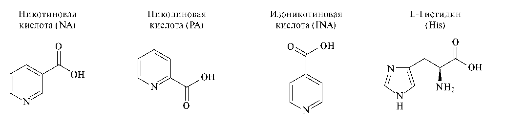 Известно, что в водных растворах аминокислота (His) и пиридинкарбоновые кислоты (NA, PA, INA) могут находиться в различных ионных формах в зависимости от рН. Ранее было показано [18, 23], что гистидин существует преимущественно в виде цвиттер-иона (HL±) в интервале рН от ~ 5.8 до 9.5, при рН > 9.5 – в форме аниона (L–), а при значениях рН, меньших 5.8 – в катионных формах (H2L+,H3L2+). Таким образом, при фиксированном значении рН 7.4 преобладает цвиттерионная форма L-гистидина (HL±), имеющая диссоциированную карбоксильную группу и протонированную α-аминогруппу; в этих условиях имидазольная группировка депротонирована [17] и вероятность наличия катионной формы (H2L+) составляет менее 5%.