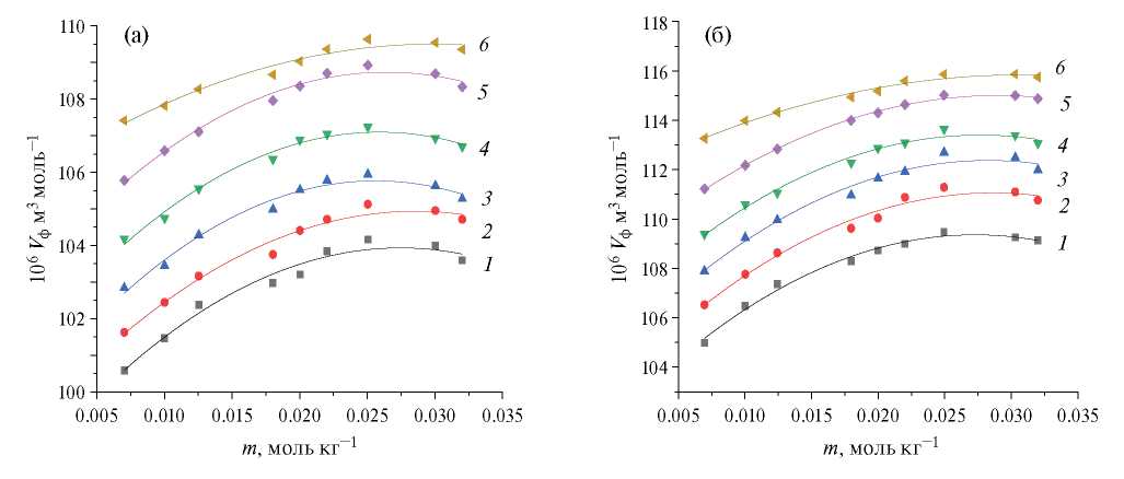 Рис. 3. Концентрационные зависимости кажущихся молярных объемов (Vϕ) пиколиновой (а) и изоникотиновой (б) кислот в водном буферном растворе L-гистидина при температурах: 288.15 (1), 293.15 (2), 298.15 (3), 303.15 (4), 308.15 (5), 313.15 K (6); mHis=0.0127±0.002 моль⋅кг–1.