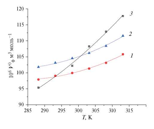 Температурные зависимости предельных кажущихся молярных объемов Vϕo пиридинкарбоновых кислот (NA, PA, INA) в буферных растворах с аминокислотой (His) представлены на рис. 4 и описываются уравнением: