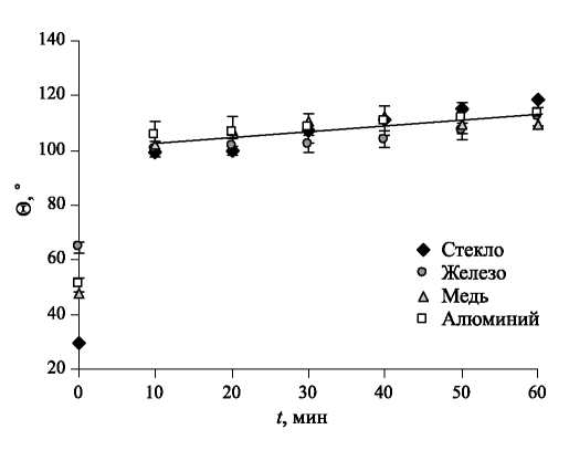 Рис. 5. Зависимость краевого угла поверхности материала, перенесенного на подложку, от времени его получения. Система: 0.1 М водный раствор YbCl3–0.10 М раствор стеариновой кислоты в гептане.
