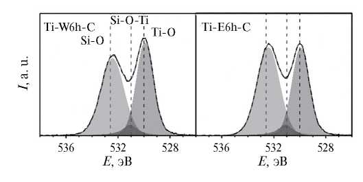 РФЭС-спектры O 1s для исходного соединения MOR-L демонстрируют характерный пик связи Si–O (533.2 эВ). Введение TiO2 сдвигает пик Si–O вниз до 532.4–532.6 эВ, и появляется характерный пик связи Ti–O 529.9 эВ (для образцов, гидролизованных в этаноле в течение 24 ч, он смещен до 530.3 эВ). Спектры O 1s также показывают появление нового состояния O примерно при 530.9–531.2 эВ, рис. 1, которое может быть связано с образованием связей Si–O–Ti [5]. Уменьшение сигнала Si-O-Ti, наблюдаемое с увеличением продолжительности гидролиза, позволяет предположить, что наименьшее время гидролиза обеспечивает наиболее эффективную иммобилизацию наночастиц TiO2 на слоях цеолита.