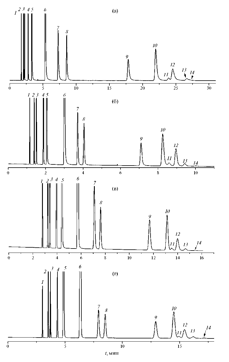 Рис. 2. Хроматограммы смеси углеводородов С1 – С5 на колонках с сорбентом на основе силикагеля: (а) колонка GS-GasPro 30 м × 0.32 мм; Т = 60°C, Р = 0.6 бар; (б) колонка Si-025 15 м × 0.25 мм; Т = 60°C, Р = 2.5 бар; (в) колонка Si-032 30 м × 0.32 мм; Т = 70°C, Р = 2.5 бар; (г) колонка Si-053 30 м × 0.32 мм; Т = 70°C, Р = 1.6 бар. Газ-носитель – гелий. Детектор – пламенно-ионизационный; 1 – метан, 2 – этан, 3 – этилен, 4 – ацетилен, 5 – пропан, 6 – пропилен, 7 – изобутан, 8 – н-бутан, 9 – бутен-1, 10 – бутадиен-1,3, 11 – транс-бутен-2, 12 – изобутен, 13 – цис-бутен-2, 14 – изопентан.
