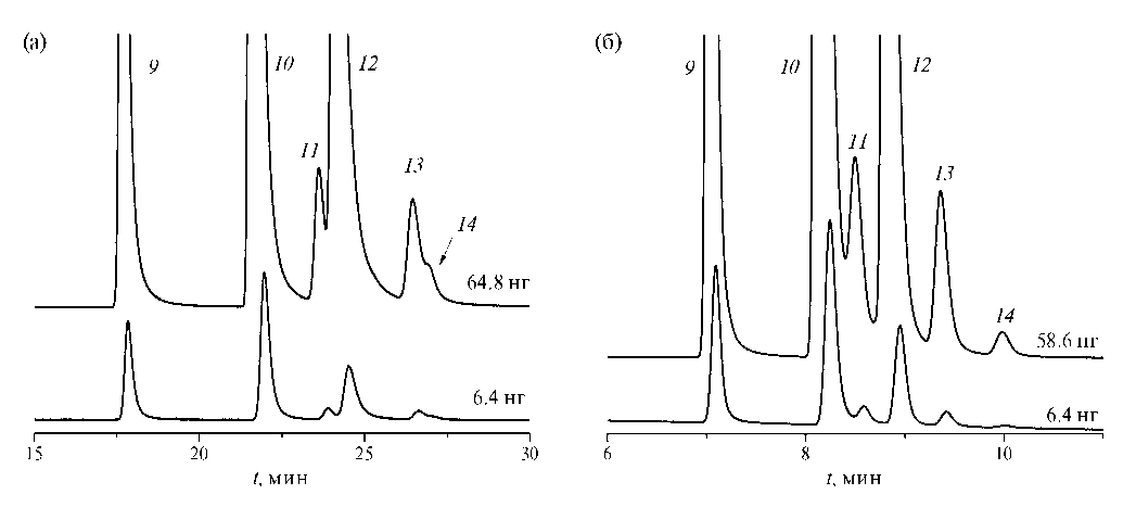 Разделение группы пиков непредельных углеводородов C4 на колонке Si-025 представлено на рис. 3б. Видно, что в отличие от колонки GS-GasPro, пара пиков транс-бутен-2/изобутен разделяется удовлетворительно. Величина фактора разрешения для данной пары пиков больше 1 при загрузках до 100 нг (см. табл. 2). Бутадиен-1,3 и транс-бутен-2 при любой величине загрузки удовлетворительно разделяются на колонке GS-GasPro (R>3). Эти же аналиты несколько хуже разделяются на колонке Si-025. Однако, как видно из табл. 2, для пары пиков бутадиен-1,3/транс-бутен-2 фактор разрешения R даже при загрузке 100 нг составляет 1.4. Кроме того, на данной колонке при любых загрузках хорошо разделяются пики цис-бутена-2 и изопентана даже при длине колонки 15 м. Разделение исследуемой смеси на колонке Si-025 занимает 10 мин (пик изопентана). На колонке GS-GasPro пик изопентана элюируется на 27 минуте. То есть на колонке Si-025 удается провести разделение почти в 3 раза быстрее. Ее загрузочная емкость при этом более, чем в 2 раза выше, чем на коммерческой колонке.